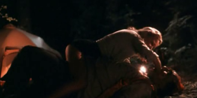 The city folk are represented by the ubiquitous practical joker Jonathan (Chris Lemmon), who slips into cliché when he drops litter and cracks jokes about inbreeding; the veteran climber Warren (Gregg Henry) who has inherited the stretch of land in the mountains they are camping in; the studious and sexually frustrated photographer Daniel (Ralph Seymour); the sexually precocious Merry Cat (Katie Powell) and the surprisingly resourceful Connie (Deborah Benson), who knows how to pitch a tent and possesses basic survival skills. With the exception of Daniel and Merry Cat the characters are sharply drawn. The trajectories of Warren and Connie for example are very interesting, and Jonathan’s long drawn out torment at the hands of the mysterious assailant illustrates the seriousness beneath the façade of stupidity. All the youngsters are competently written and are a surprisingly sympathetic bunch; I didn’t spend the entire film hoping for the death of characters that the writers intend to irritate. The abandoned church makes a most welcome return later in the film in another standout sequence. The camera uses the poor vision of Daniel to create mounting tension, his point-of-view shot a mere blur as a figure strolls determinedly closer. This sequence also reveals a major plot twist, but one that can be telegraphed through a series of hints early on.